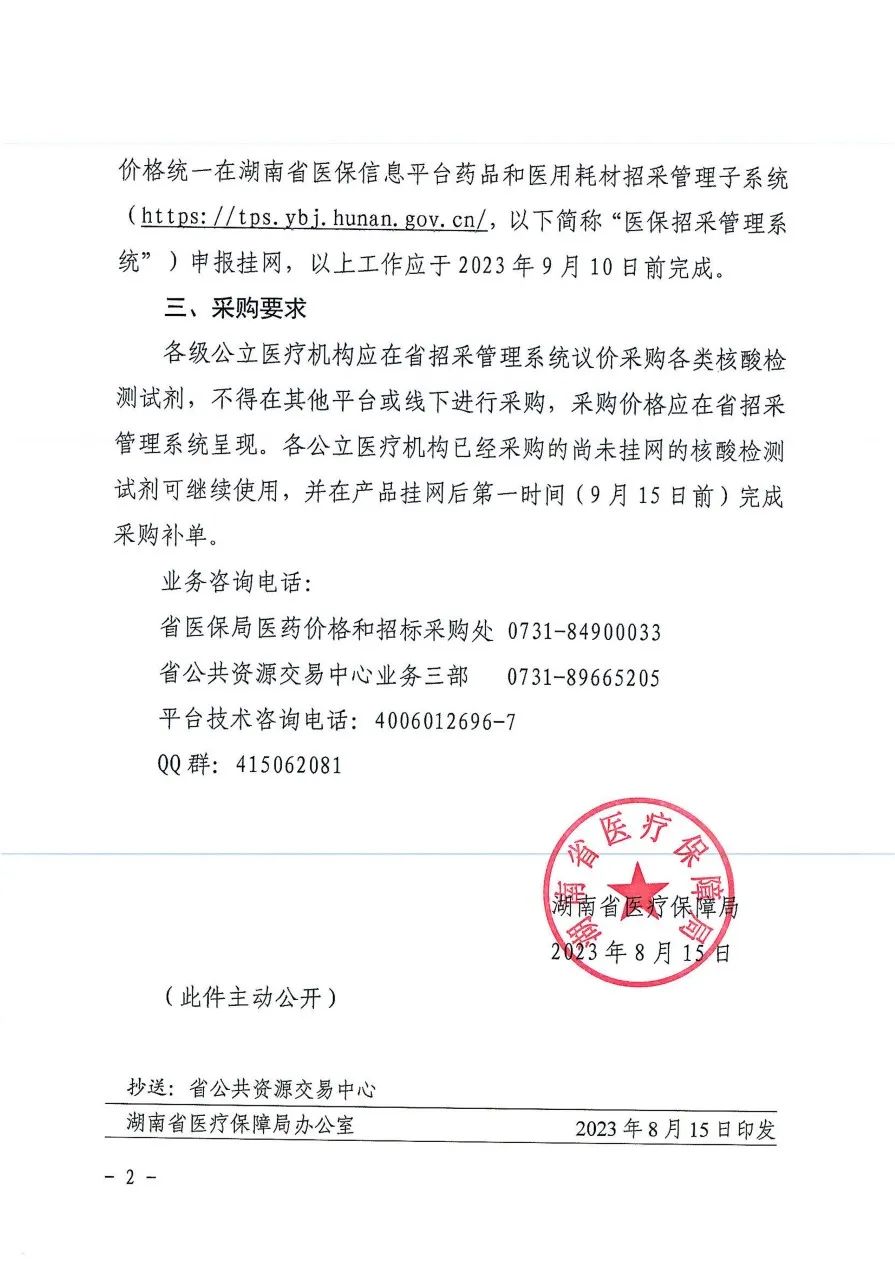 2023年8月16日,湖南省醫(yī)保局發(fā)布《關(guān)于核酸檢測(cè)試劑實(shí)行陽(yáng)光掛網(wǎng)采購(gòu)有關(guān)事項(xiàng)的通知》,要求相關(guān)生產(chǎn)企業(yè)將用于各類核酸檢測(cè)的上市試劑產(chǎn)品(新型冠狀病毒核酸檢測(cè)類除外)于2023年9月10日前,以湖南省醫(yī)療機(jī)構(gòu)實(shí)際交易最低價(jià)在湖南醫(yī)保招采管理系統(tǒng)申報(bào)掛網(wǎng)。