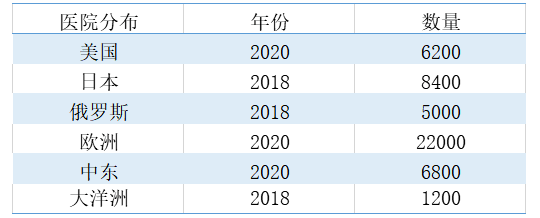 根據(jù)上圖所示,不完全統(tǒng)計表明2020年美國約有6200家醫(yī)院,歐洲約有22000家,中東約有6800家醫(yī)院,2018年日本有8400家醫(yī)院,大洋洲有1200家醫(yī)院,俄羅斯有5000家醫(yī)院。