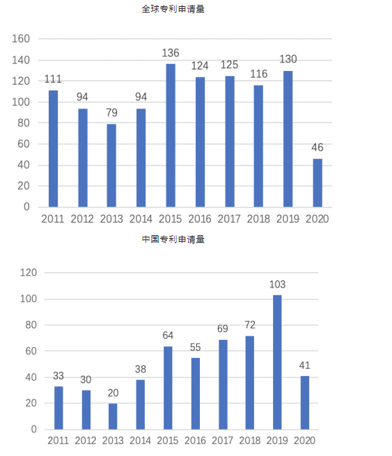 上圖所示為以“病理診斷”和“細(xì)胞病理”進(jìn)行全球檢索得到的近10年的專利申請情況。從圖中可以看出,病理診斷領(lǐng)域近10年約有1055件專利申請(由于發(fā)明專利有18個月公開的滯后期,實用新型從申請到公開也需一段時間,因此2019年和2020年數(shù)據(jù)有所偏差),其中發(fā)明專利604件、實用新型專利179件。從圖2中可以看出,全中國病理診斷領(lǐng)域近10年約有525件專利申請(由于發(fā)明專利有18個月公開的滯后期,實用新型從申請到公開也需一段時間,因此2019年和2020年數(shù)據(jù)有所偏差)。