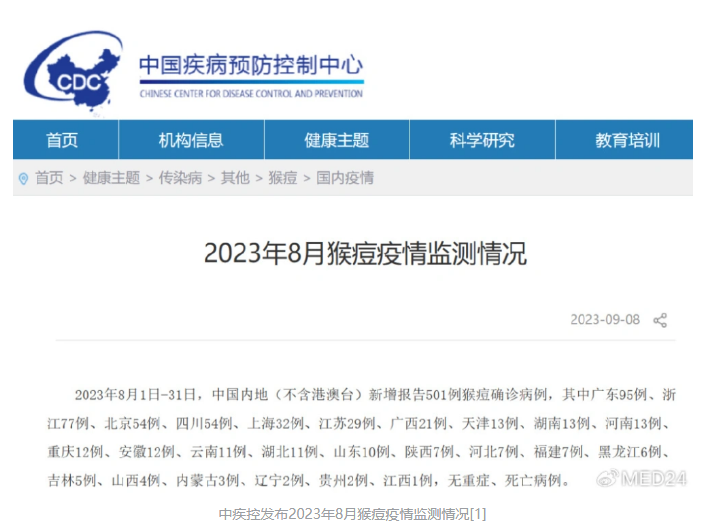 9月8日,中疾控發(fā)布8月猴痘疫情監(jiān)測情況[1]。2023年8月1日-31日,中國內(nèi)地(不含港澳臺)新增報告501例猴痘確診病例,相較7月增加10例。